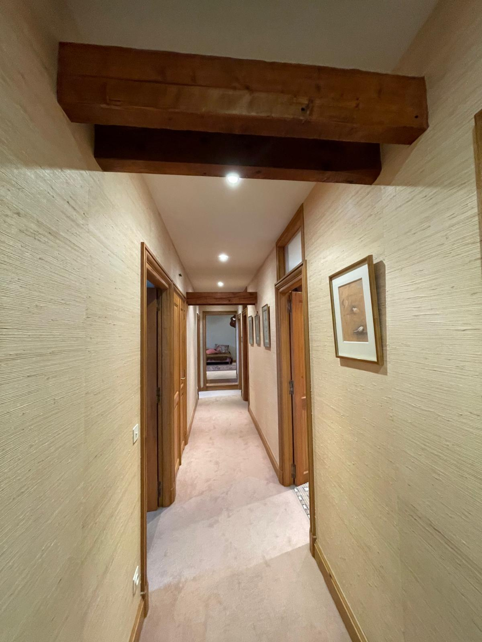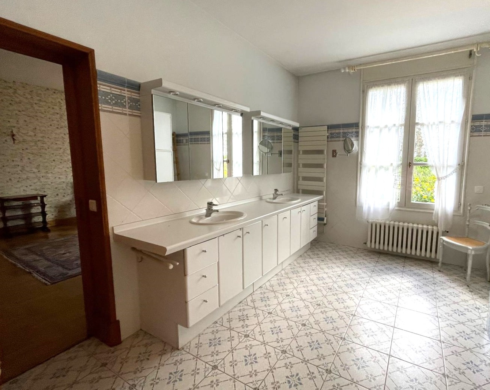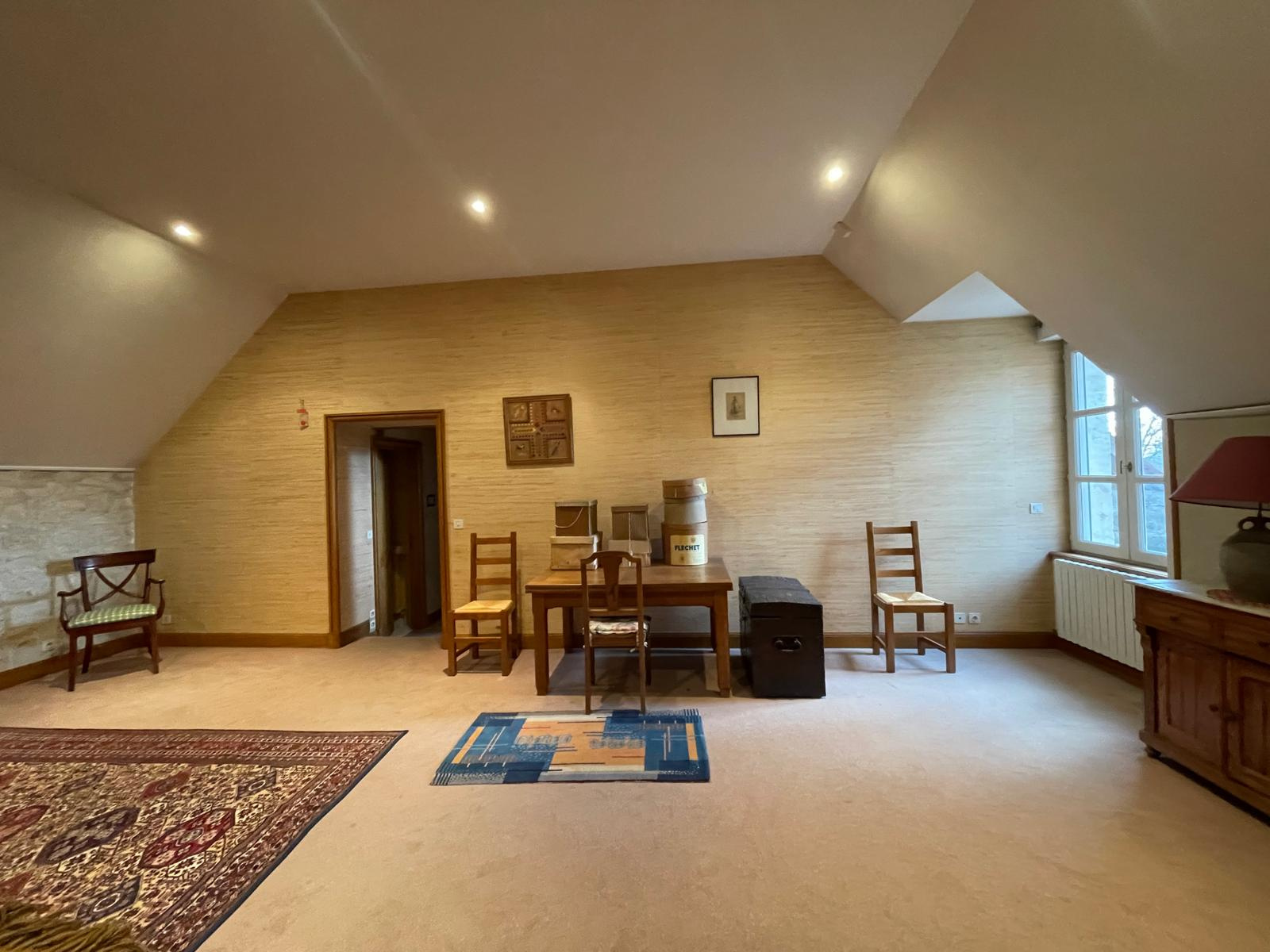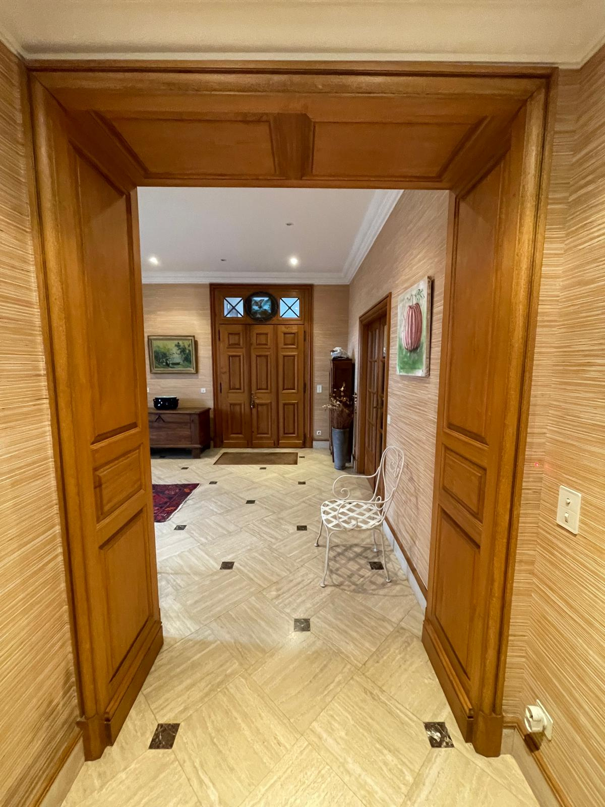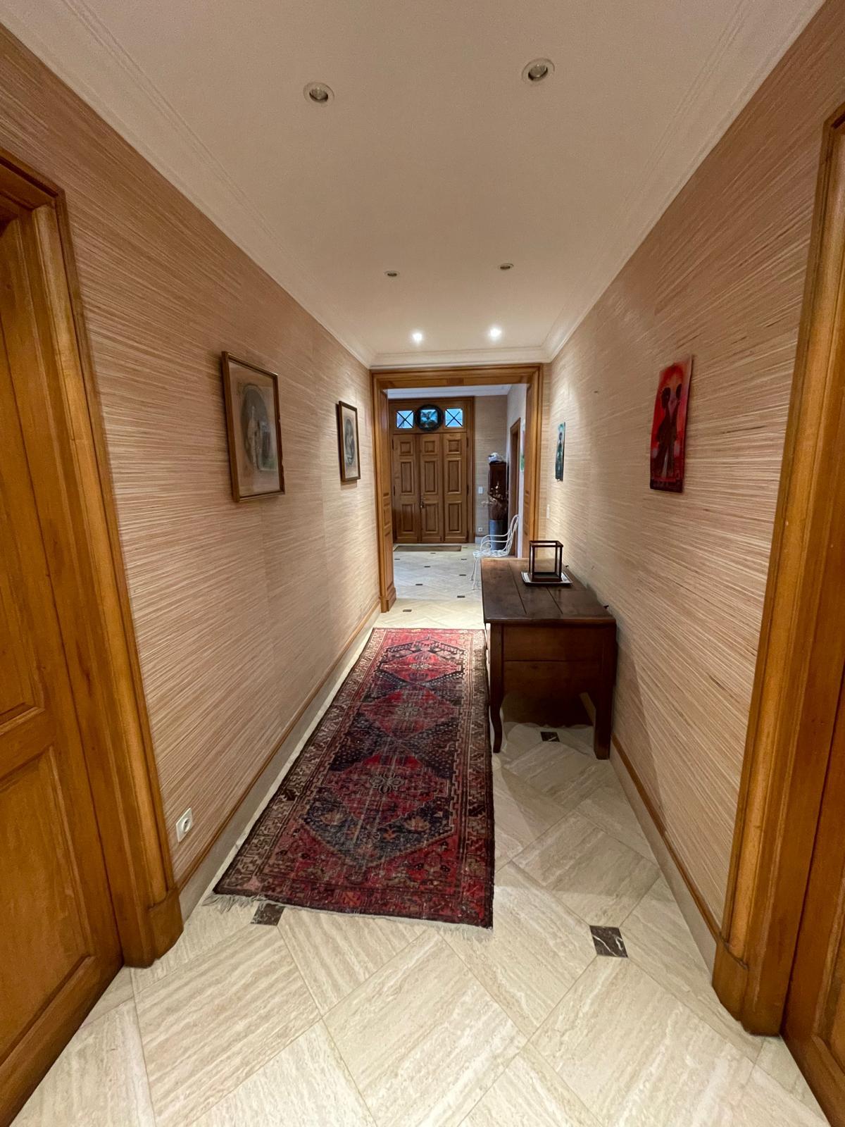 Une vaste entrée de réception dessert les pièces de vie avec cheminées ainsi que la cuisine aménagée ; corridor d'accès aux sanitaires et aux pièces annexes (lingerie, buanderie, cellier). Un sas indépendant permet d'accéder à un bureau et deux vastes chambres, chacune avec sa salle de bains privatives et sanitaires, dressing.