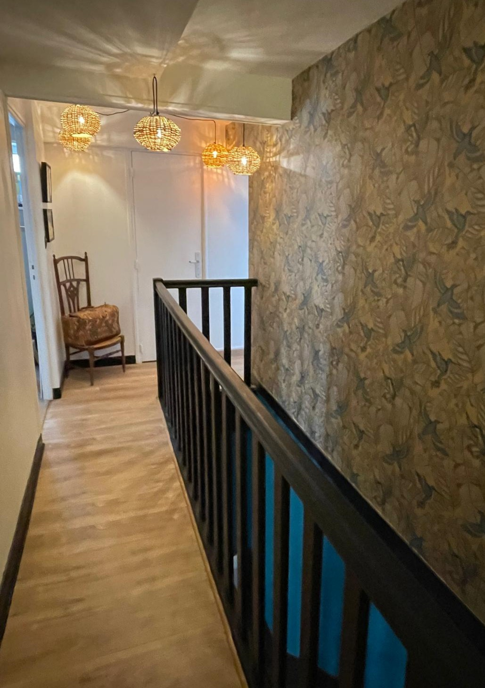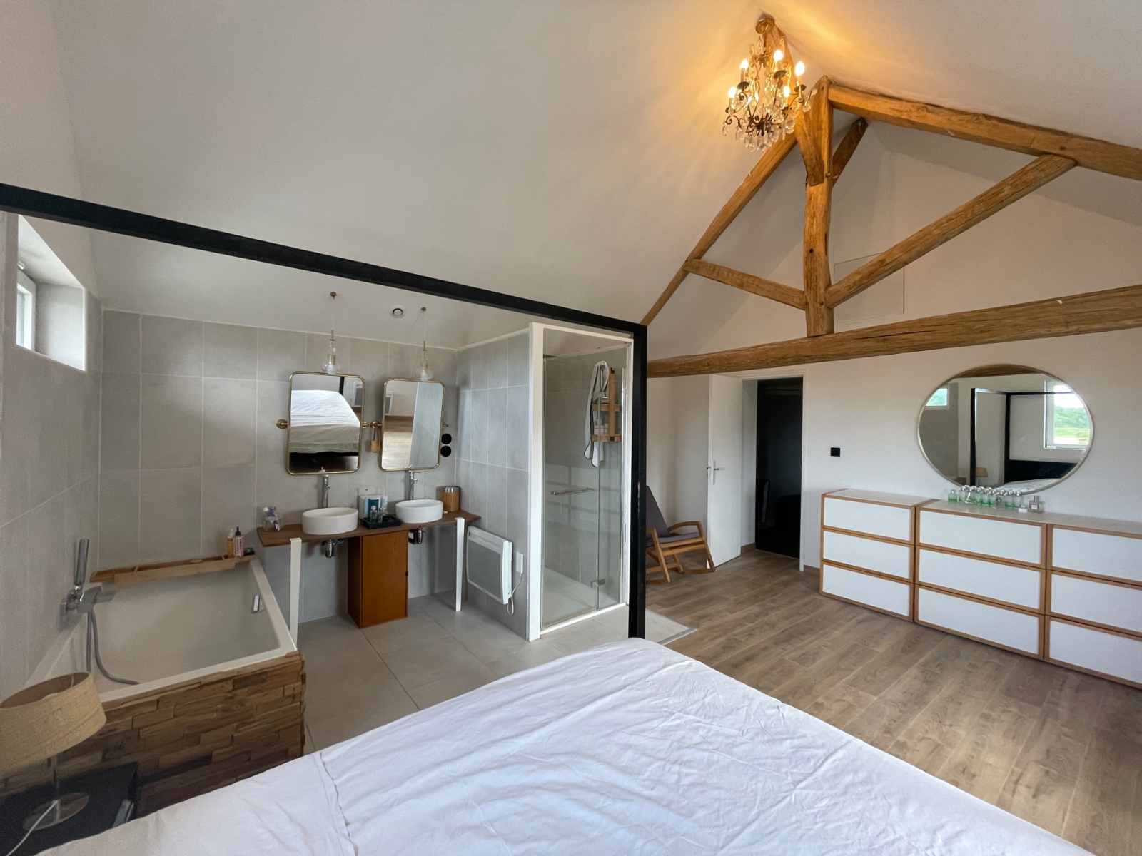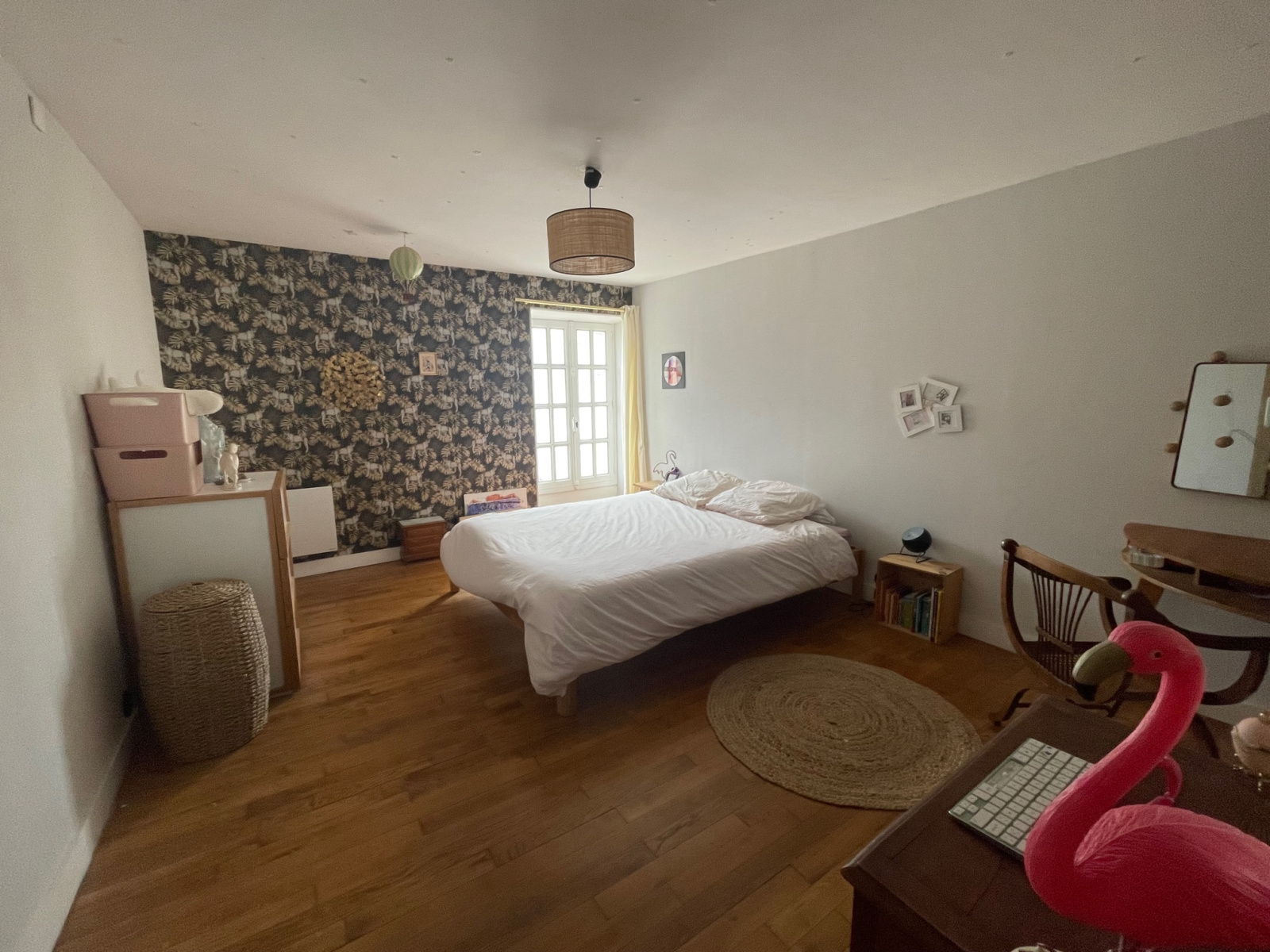L'étage dessert deux chambres de belles dimensions (16,65 et 14,08m²), une salle d'eau, wc, un espace loisirs / bureau permettant d'accéder à une vaste chambre parentale avec salle de bains + douche d'environ 22m² avec charpente apparente.